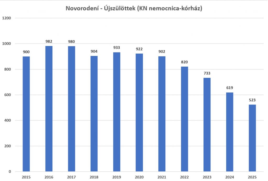 V roku 2025 sa v Komárne narodilo len 141 detí, čo predstavuje 23-percentný pokles v porovnaní s predchádzajúcim rokom. Počet narodených detí klesá už viac než desať rokov, avšak v poslednom období sa tento proces ešte viac zrýchlil: za sedem rokov sa počet novorodencov znížil na polovicu.
